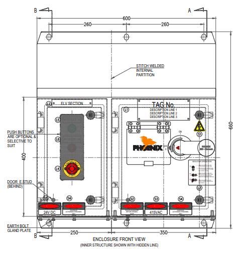 Specifically designed for demanding mining and industrial environments, the Phoenix EMS Fully Welded LCS oers rugged protection for electrical control and termination systems. Its fully welded 316 stainless steel construction, IP66-rated doors, and fully earthed panels provide reliability and long-term safety under harsh conditions.